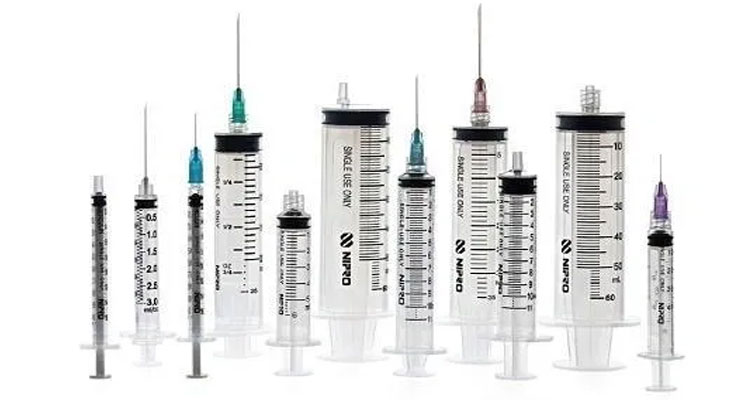 A syringe is a medical device used to inject medication into the body. A syringe is generally a cylindrical, graduated device with a plunger at the end that, when pushed by hand, directs the medication forward and enters the body tissue through a sharp needle.